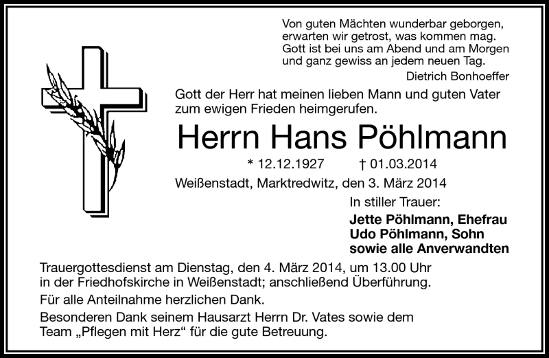 Hier finden Sie alle Traueranzeigen aus der Zeitung, die bisher für ^Hans Pöhlmann erschienen sind. Weitere Traueranzeigen, die in der Zeitung erscheinen, werden hier ebenfalls aufgelistet