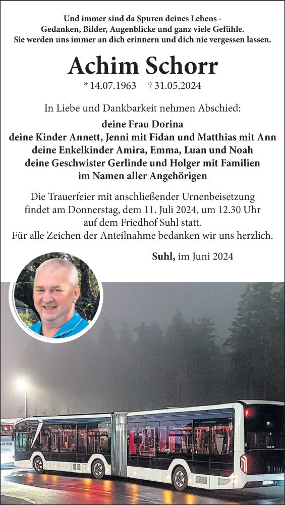 Hier finden Sie alle Traueranzeigen aus der Zeitung, die bisher für Achim Schorr erschienen sind. Weitere Traueranzeigen, die in der Zeitung erscheinen, werden hier ebenfalls aufgelistet