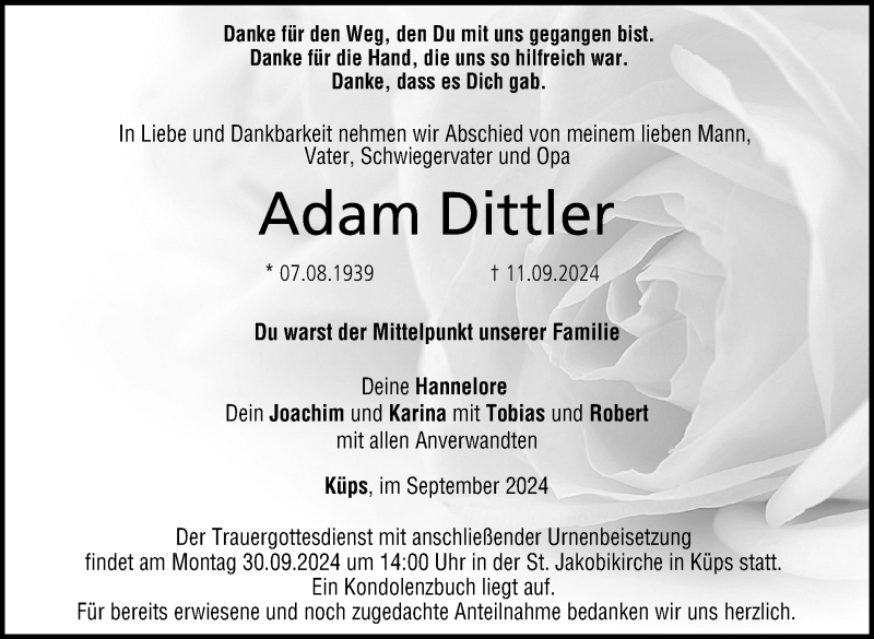 Hier finden Sie alle Traueranzeigen aus der Zeitung, die bisher für Adam Dittler erschienen sind. Weitere Traueranzeigen, die in der Zeitung erscheinen, werden hier ebenfalls aufgelistet