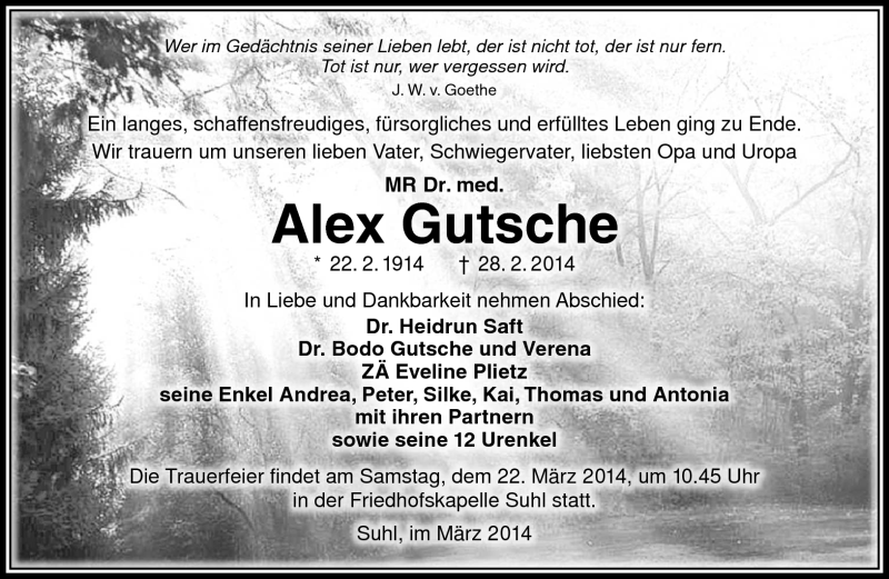 Hier finden Sie alle Traueranzeigen aus der Zeitung, die bisher für Alex Gutsche erschienen sind. Weitere Traueranzeigen, die in der Zeitung erscheinen, werden hier ebenfalls aufgelistet