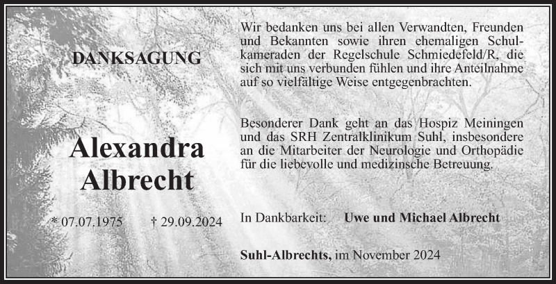 Hier finden Sie alle Traueranzeigen aus der Zeitung, die bisher für Alexandra Albrecht erschienen sind. Weitere Traueranzeigen, die in der Zeitung erscheinen, werden hier ebenfalls aufgelistet