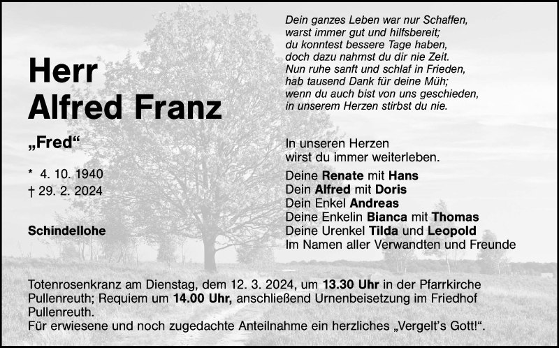 Hier finden Sie alle Traueranzeigen aus der Zeitung, die bisher für Alfred Franz erschienen sind. Weitere Traueranzeigen, die in der Zeitung erscheinen, werden hier ebenfalls aufgelistet