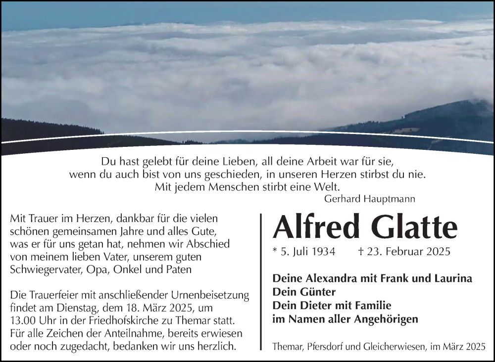 Hier finden Sie alle Traueranzeigen aus der Zeitung, die bisher für Alfred Glatte erschienen sind. Weitere Traueranzeigen, die in der Zeitung erscheinen, werden hier ebenfalls aufgelistet