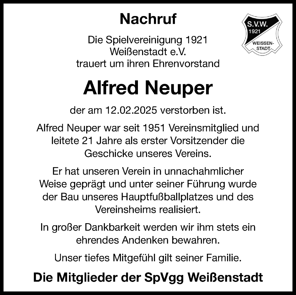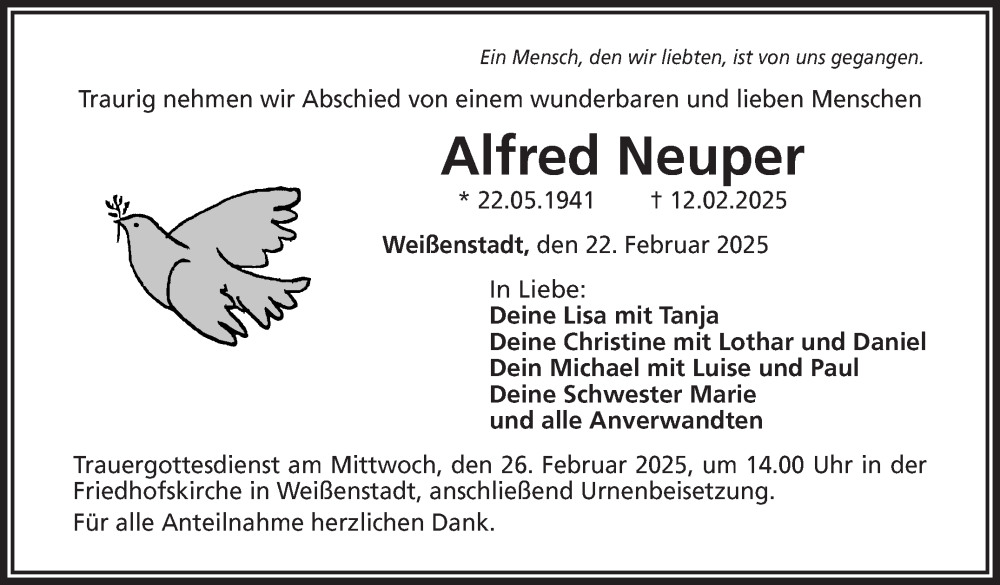 Hier finden Sie alle Traueranzeigen aus der Zeitung, die bisher für Alfred Neuper erschienen sind. Weitere Traueranzeigen, die in der Zeitung erscheinen, werden hier ebenfalls aufgelistet
