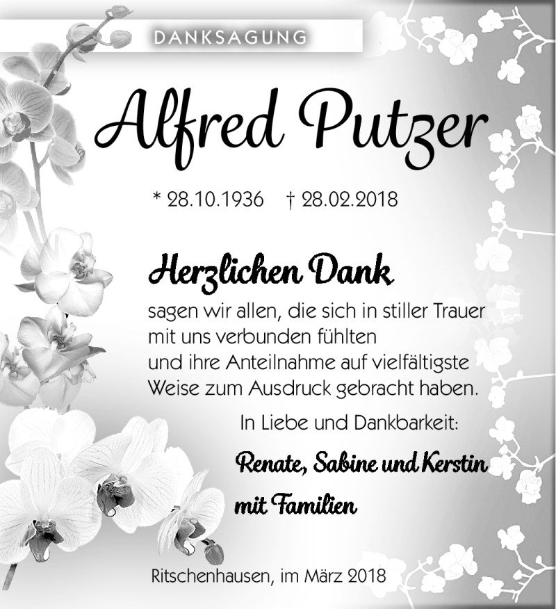 Hier finden Sie alle Traueranzeigen aus der Zeitung, die bisher für Alfred Putzer erschienen sind. Weitere Traueranzeigen, die in der Zeitung erscheinen, werden hier ebenfalls aufgelistet