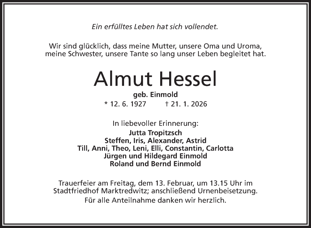 Hier finden Sie alle Traueranzeigen aus der Zeitung, die bisher für Almut Hessel erschienen sind. Weitere Traueranzeigen, die in der Zeitung erscheinen, werden hier ebenfalls aufgelistet