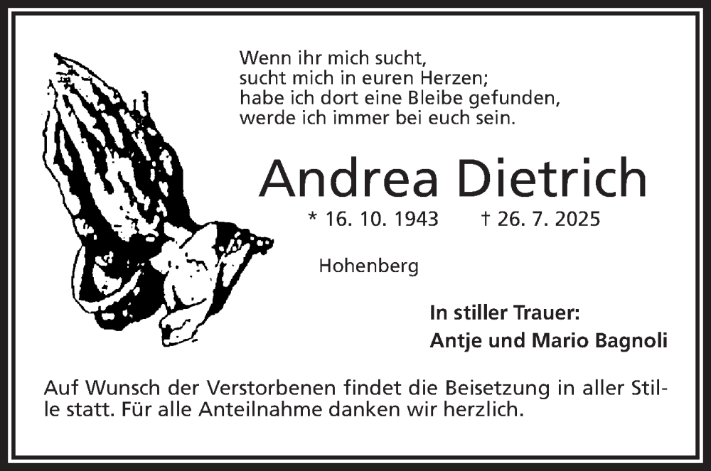 Hier finden Sie alle Traueranzeigen aus der Zeitung, die bisher für Andrea Dietrich erschienen sind. Weitere Traueranzeigen, die in der Zeitung erscheinen, werden hier ebenfalls aufgelistet