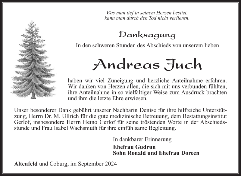 Hier finden Sie alle Traueranzeigen aus der Zeitung, die bisher für Andreas Juch erschienen sind. Weitere Traueranzeigen, die in der Zeitung erscheinen, werden hier ebenfalls aufgelistet