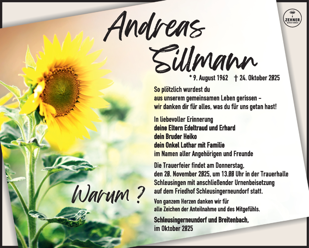Hier finden Sie alle Traueranzeigen aus der Zeitung, die bisher für Andreas Sillmann erschienen sind. Weitere Traueranzeigen, die in der Zeitung erscheinen, werden hier ebenfalls aufgelistet
