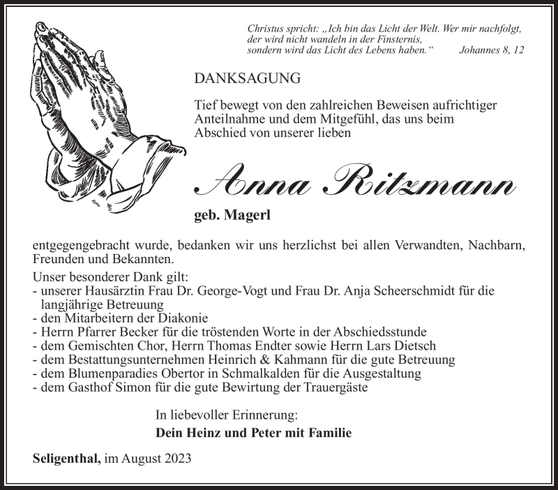 Hier finden Sie alle Traueranzeigen aus der Zeitung, die bisher für Anna Ritzmann erschienen sind. Weitere Traueranzeigen, die in der Zeitung erscheinen, werden hier ebenfalls aufgelistet