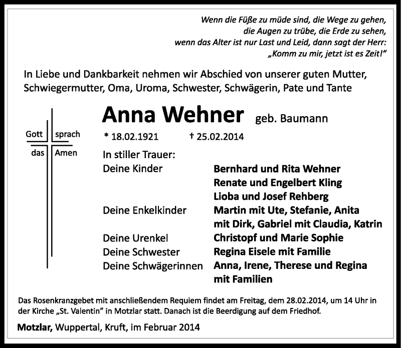 Hier finden Sie alle Traueranzeigen aus der Zeitung, die bisher für Anna Wehner erschienen sind. Weitere Traueranzeigen, die in der Zeitung erscheinen, werden hier ebenfalls aufgelistet