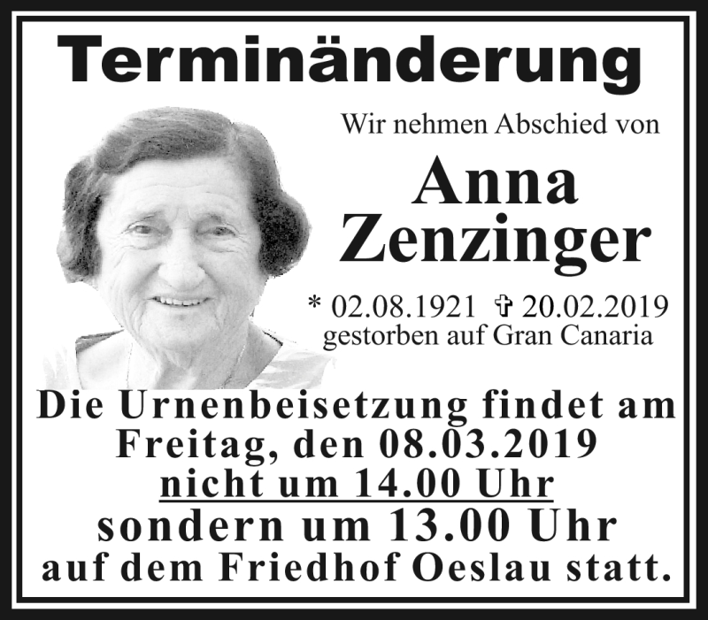 Hier finden Sie alle Traueranzeigen aus der Zeitung, die bisher für Anna Zenzinger erschienen sind. Weitere Traueranzeigen, die in der Zeitung erscheinen, werden hier ebenfalls aufgelistet