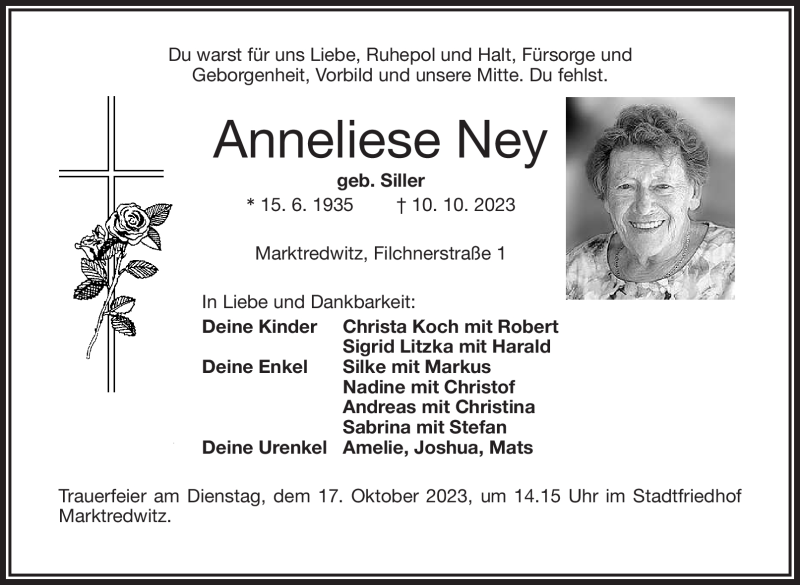 Hier finden Sie alle Traueranzeigen aus der Zeitung, die bisher für Anneliese Ney erschienen sind. Weitere Traueranzeigen, die in der Zeitung erscheinen, werden hier ebenfalls aufgelistet