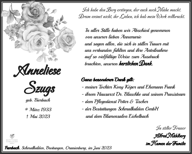 Hier finden Sie alle Traueranzeigen aus der Zeitung, die bisher für Anneliese Szugs erschienen sind. Weitere Traueranzeigen, die in der Zeitung erscheinen, werden hier ebenfalls aufgelistet