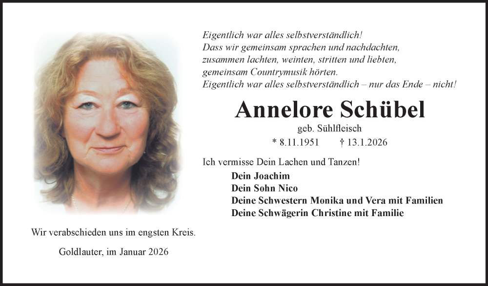 Hier finden Sie alle Traueranzeigen aus der Zeitung, die bisher für Annelore Schübel erschienen sind. Weitere Traueranzeigen, die in der Zeitung erscheinen, werden hier ebenfalls aufgelistet