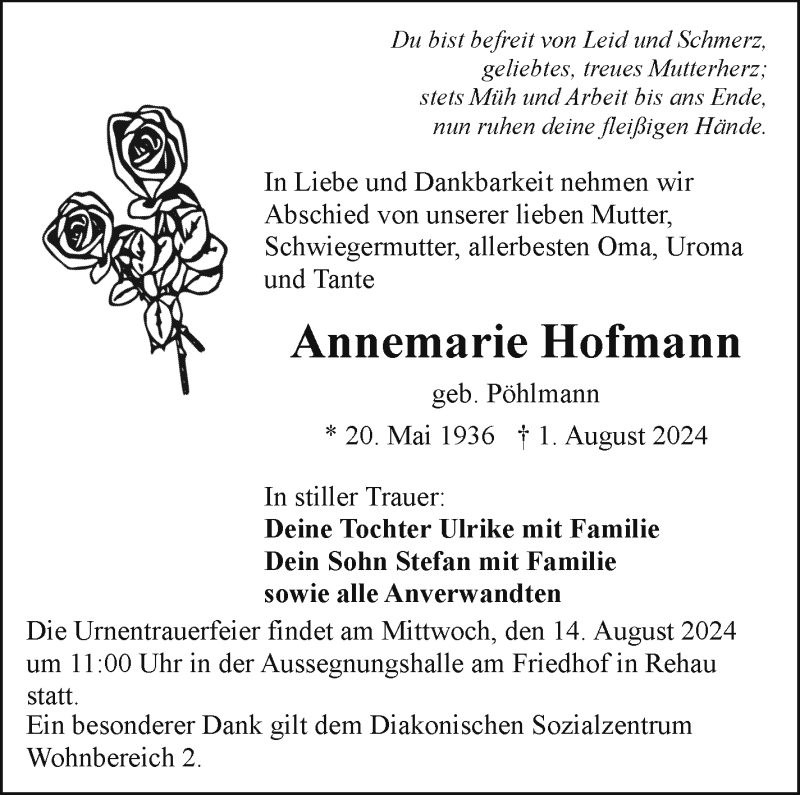 Hier finden Sie alle Traueranzeigen aus der Zeitung, die bisher für Annemarie Hofmann erschienen sind. Weitere Traueranzeigen, die in der Zeitung erscheinen, werden hier ebenfalls aufgelistet
