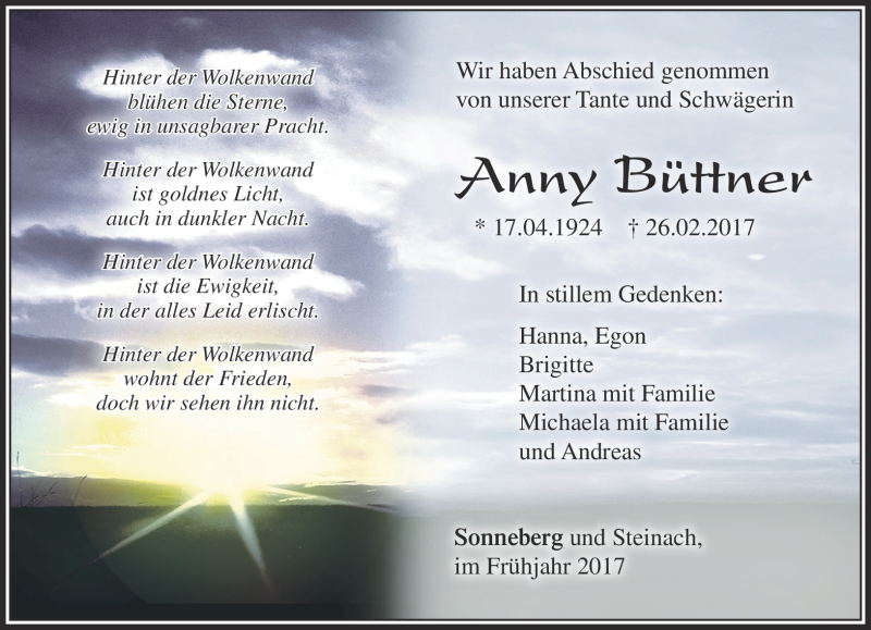 Hier finden Sie alle Traueranzeigen aus der Zeitung, die bisher für Anni Büttner erschienen sind. Weitere Traueranzeigen, die in der Zeitung erscheinen, werden hier ebenfalls aufgelistet