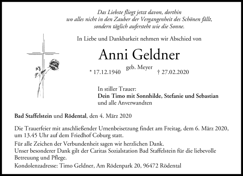 Hier finden Sie alle Traueranzeigen aus der Zeitung, die bisher für Anni Geldner erschienen sind. Weitere Traueranzeigen, die in der Zeitung erscheinen, werden hier ebenfalls aufgelistet
