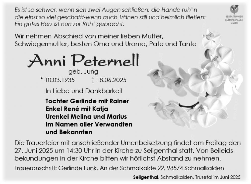 Hier finden Sie alle Traueranzeigen aus der Zeitung, die bisher für Anni Peternell erschienen sind. Weitere Traueranzeigen, die in der Zeitung erscheinen, werden hier ebenfalls aufgelistet