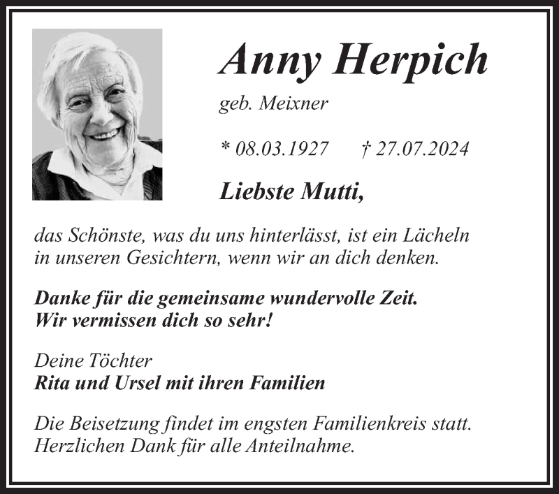Hier finden Sie alle Traueranzeigen aus der Zeitung, die bisher für Anny Herpich erschienen sind. Weitere Traueranzeigen, die in der Zeitung erscheinen, werden hier ebenfalls aufgelistet