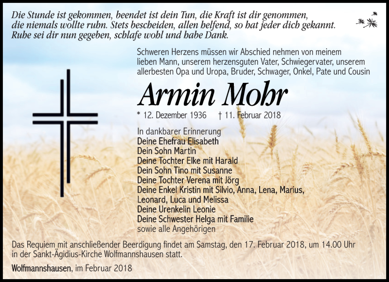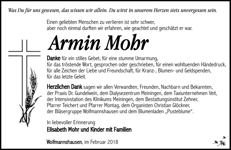Hier finden Sie alle Traueranzeigen aus der Zeitung, die bisher für Armin Mohr erschienen sind. Weitere Traueranzeigen, die in der Zeitung erscheinen, werden hier ebenfalls aufgelistet