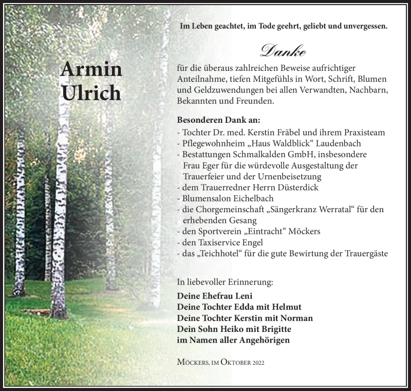 Hier finden Sie alle Traueranzeigen aus der Zeitung, die bisher für Armin Ulrich erschienen sind. Weitere Traueranzeigen, die in der Zeitung erscheinen, werden hier ebenfalls aufgelistet