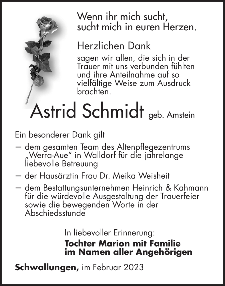 Hier finden Sie alle Traueranzeigen aus der Zeitung, die bisher für Astrid Schmidt erschienen sind. Weitere Traueranzeigen, die in der Zeitung erscheinen, werden hier ebenfalls aufgelistet