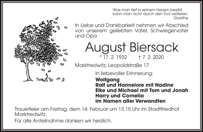 Hier finden Sie alle Traueranzeigen aus der Zeitung, die bisher für August Biersack erschienen sind. Weitere Traueranzeigen, die in der Zeitung erscheinen, werden hier ebenfalls aufgelistet