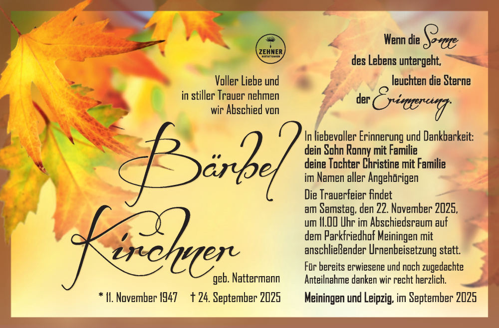 Hier finden Sie alle Traueranzeigen aus der Zeitung, die bisher für Bärbel Kirchner erschienen sind. Weitere Traueranzeigen, die in der Zeitung erscheinen, werden hier ebenfalls aufgelistet