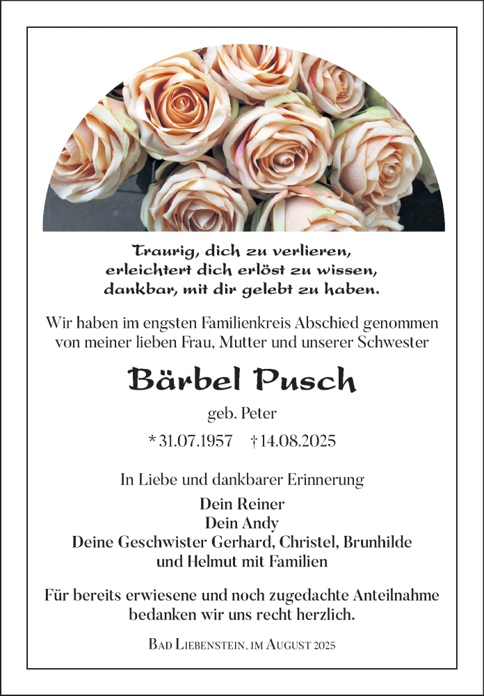 Hier finden Sie alle Traueranzeigen aus der Zeitung, die bisher für Bärbel Pusch erschienen sind. Weitere Traueranzeigen, die in der Zeitung erscheinen, werden hier ebenfalls aufgelistet