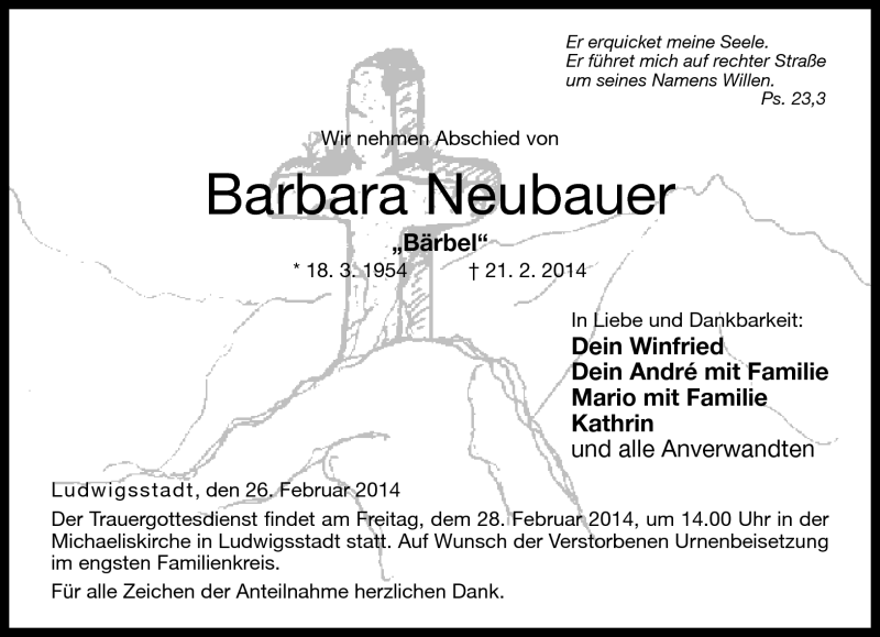 Hier finden Sie alle Traueranzeigen aus der Zeitung, die bisher für Barbara Neubauer erschienen sind. Weitere Traueranzeigen, die in der Zeitung erscheinen, werden hier ebenfalls aufgelistet