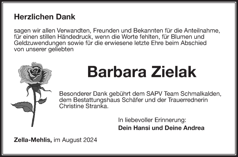 Hier finden Sie alle Traueranzeigen aus der Zeitung, die bisher für Barbara Zielak erschienen sind. Weitere Traueranzeigen, die in der Zeitung erscheinen, werden hier ebenfalls aufgelistet