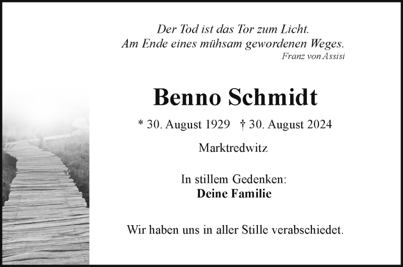 Hier finden Sie alle Traueranzeigen aus der Zeitung, die bisher für Benno Schmidt erschienen sind. Weitere Traueranzeigen, die in der Zeitung erscheinen, werden hier ebenfalls aufgelistet