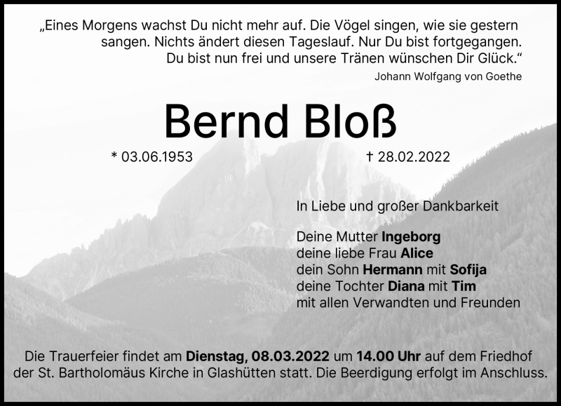 Hier finden Sie alle Traueranzeigen aus der Zeitung, die bisher für Bernd Bloß erschienen sind. Weitere Traueranzeigen, die in der Zeitung erscheinen, werden hier ebenfalls aufgelistet