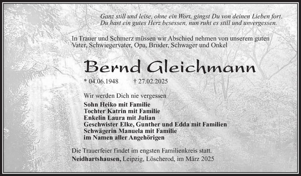 Hier finden Sie alle Traueranzeigen aus der Zeitung, die bisher für Bernd Gleichmann erschienen sind. Weitere Traueranzeigen, die in der Zeitung erscheinen, werden hier ebenfalls aufgelistet