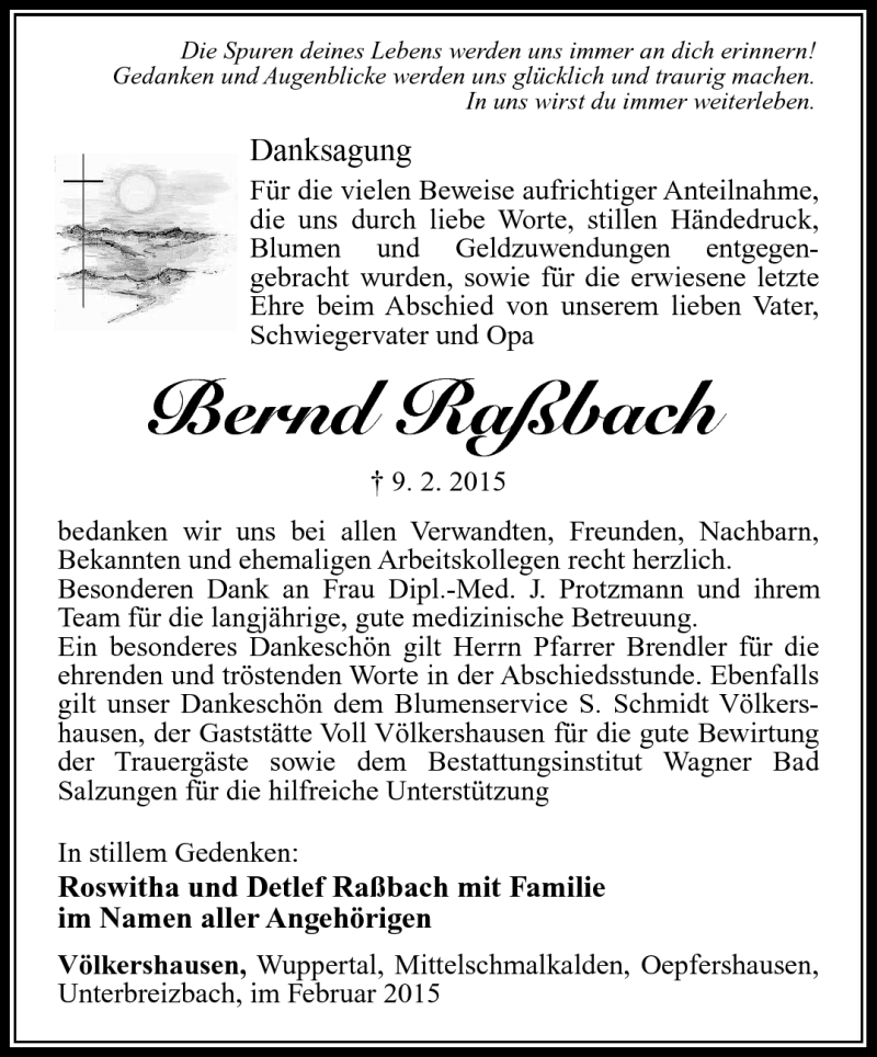 Hier finden Sie alle Traueranzeigen aus der Zeitung, die bisher für Bernd Raßbach erschienen sind. Weitere Traueranzeigen, die in der Zeitung erscheinen, werden hier ebenfalls aufgelistet