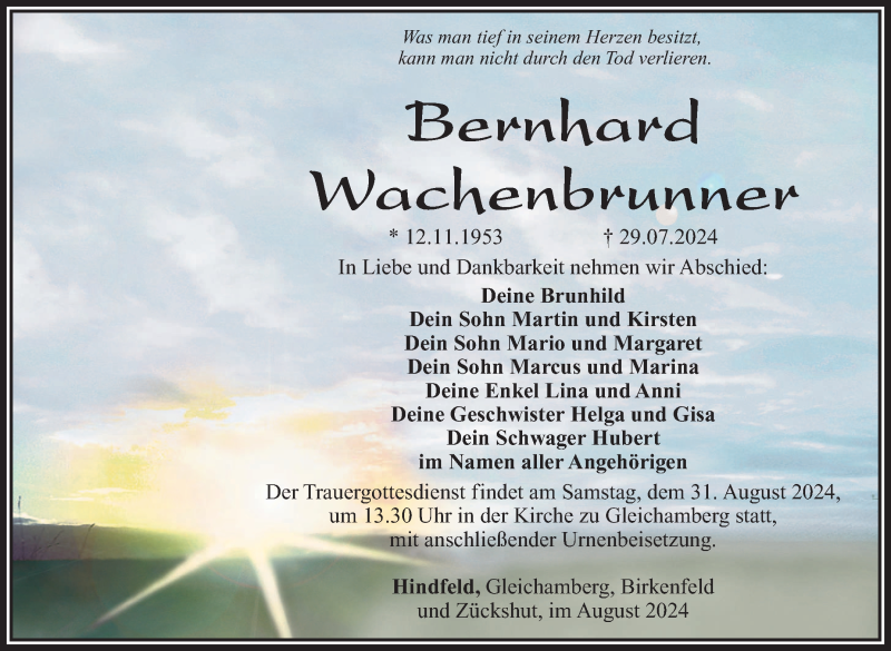 Hier finden Sie alle Traueranzeigen aus der Zeitung, die bisher für Bernhard Wachtenbrunner erschienen sind. Weitere Traueranzeigen, die in der Zeitung erscheinen, werden hier ebenfalls aufgelistet