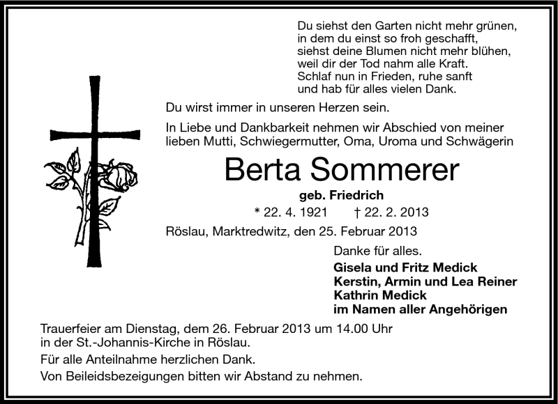 Hier finden Sie alle Traueranzeigen aus der Zeitung, die bisher für Berta Sommerer erschienen sind. Weitere Traueranzeigen, die in der Zeitung erscheinen, werden hier ebenfalls aufgelistet