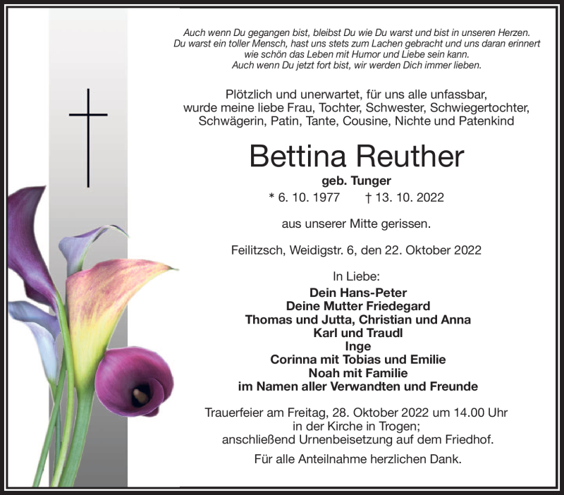 Hier finden Sie alle Traueranzeigen aus der Zeitung, die bisher für Bettina Reuther erschienen sind. Weitere Traueranzeigen, die in der Zeitung erscheinen, werden hier ebenfalls aufgelistet