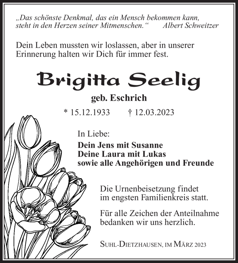 Hier finden Sie alle Traueranzeigen aus der Zeitung, die bisher für Brigitta Seelig erschienen sind. Weitere Traueranzeigen, die in der Zeitung erscheinen, werden hier ebenfalls aufgelistet