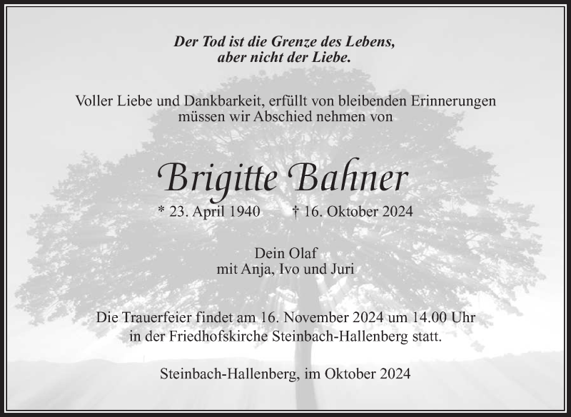 Hier finden Sie alle Traueranzeigen aus der Zeitung, die bisher für Brigitte Bahner erschienen sind. Weitere Traueranzeigen, die in der Zeitung erscheinen, werden hier ebenfalls aufgelistet