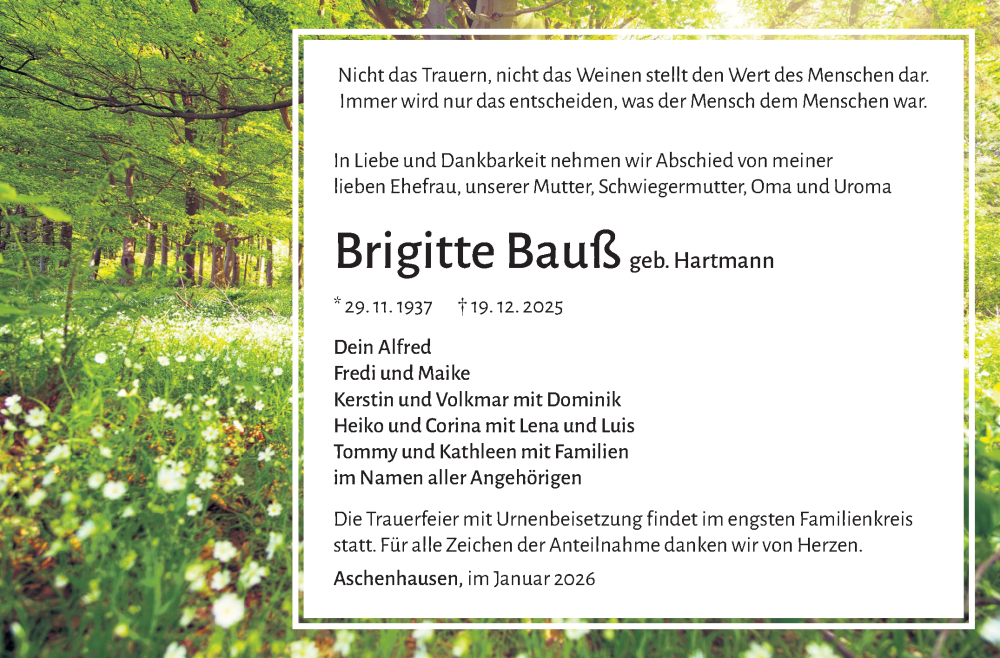Hier finden Sie alle Traueranzeigen aus der Zeitung, die bisher für Brigitte Bauß erschienen sind. Weitere Traueranzeigen, die in der Zeitung erscheinen, werden hier ebenfalls aufgelistet