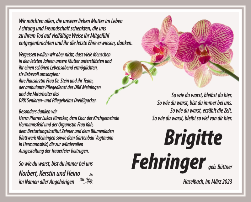 Hier finden Sie alle Traueranzeigen aus der Zeitung, die bisher für Brigitte Fehringer erschienen sind. Weitere Traueranzeigen, die in der Zeitung erscheinen, werden hier ebenfalls aufgelistet