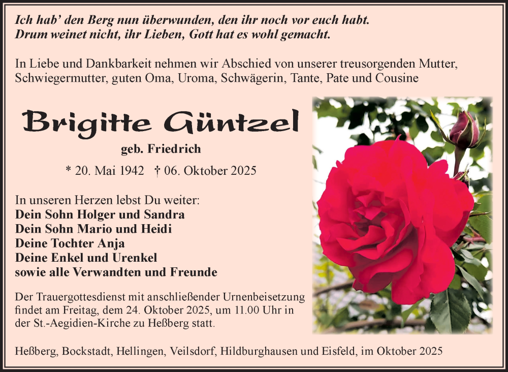 Hier finden Sie alle Traueranzeigen aus der Zeitung, die bisher für Brigitte Güntzel erschienen sind. Weitere Traueranzeigen, die in der Zeitung erscheinen, werden hier ebenfalls aufgelistet