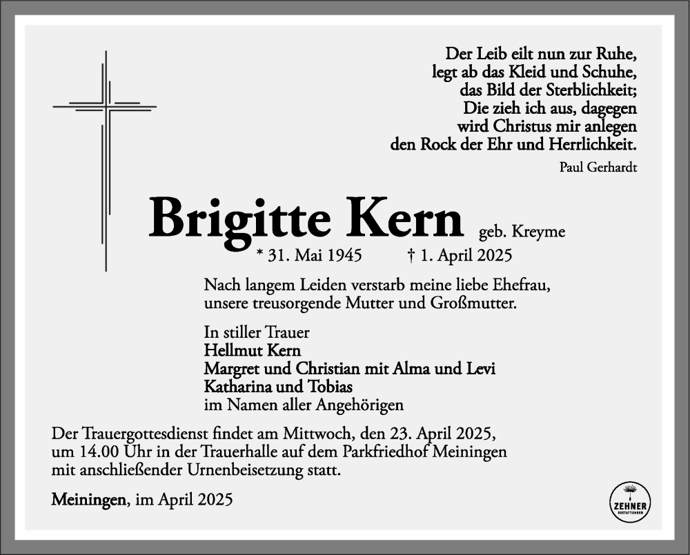 Hier finden Sie alle Traueranzeigen aus der Zeitung, die bisher für Brigitte Kern erschienen sind. Weitere Traueranzeigen, die in der Zeitung erscheinen, werden hier ebenfalls aufgelistet