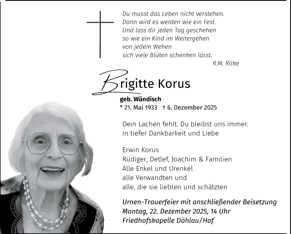 Hier finden Sie alle Traueranzeigen aus der Zeitung, die bisher für Brigitte Korus erschienen sind. Weitere Traueranzeigen, die in der Zeitung erscheinen, werden hier ebenfalls aufgelistet