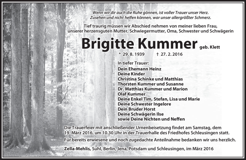 Hier finden Sie alle Traueranzeigen aus der Zeitung, die bisher für Brigitte Kummer erschienen sind. Weitere Traueranzeigen, die in der Zeitung erscheinen, werden hier ebenfalls aufgelistet
