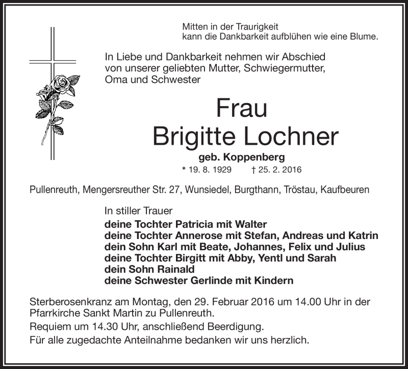 Hier finden Sie alle Traueranzeigen aus der Zeitung, die bisher für Brigitte Lochner erschienen sind. Weitere Traueranzeigen, die in der Zeitung erscheinen, werden hier ebenfalls aufgelistet