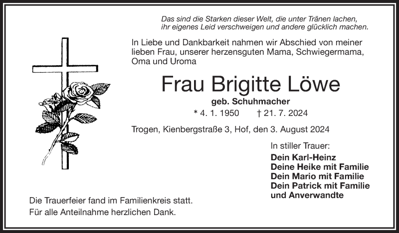 Hier finden Sie alle Traueranzeigen aus der Zeitung, die bisher für Brigitte Löwe erschienen sind. Weitere Traueranzeigen, die in der Zeitung erscheinen, werden hier ebenfalls aufgelistet