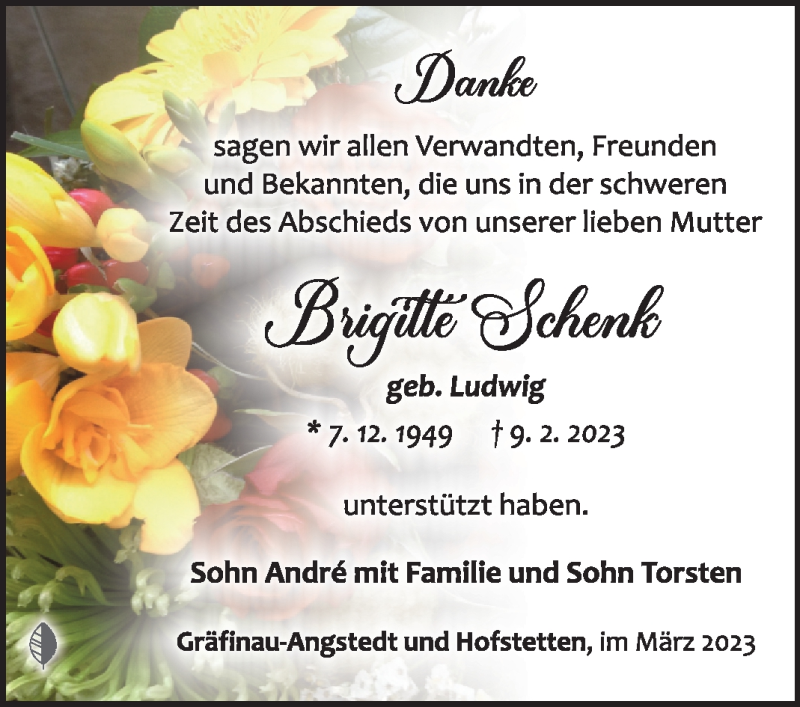 Hier finden Sie alle Traueranzeigen aus der Zeitung, die bisher für Brigitte Schenk erschienen sind. Weitere Traueranzeigen, die in der Zeitung erscheinen, werden hier ebenfalls aufgelistet